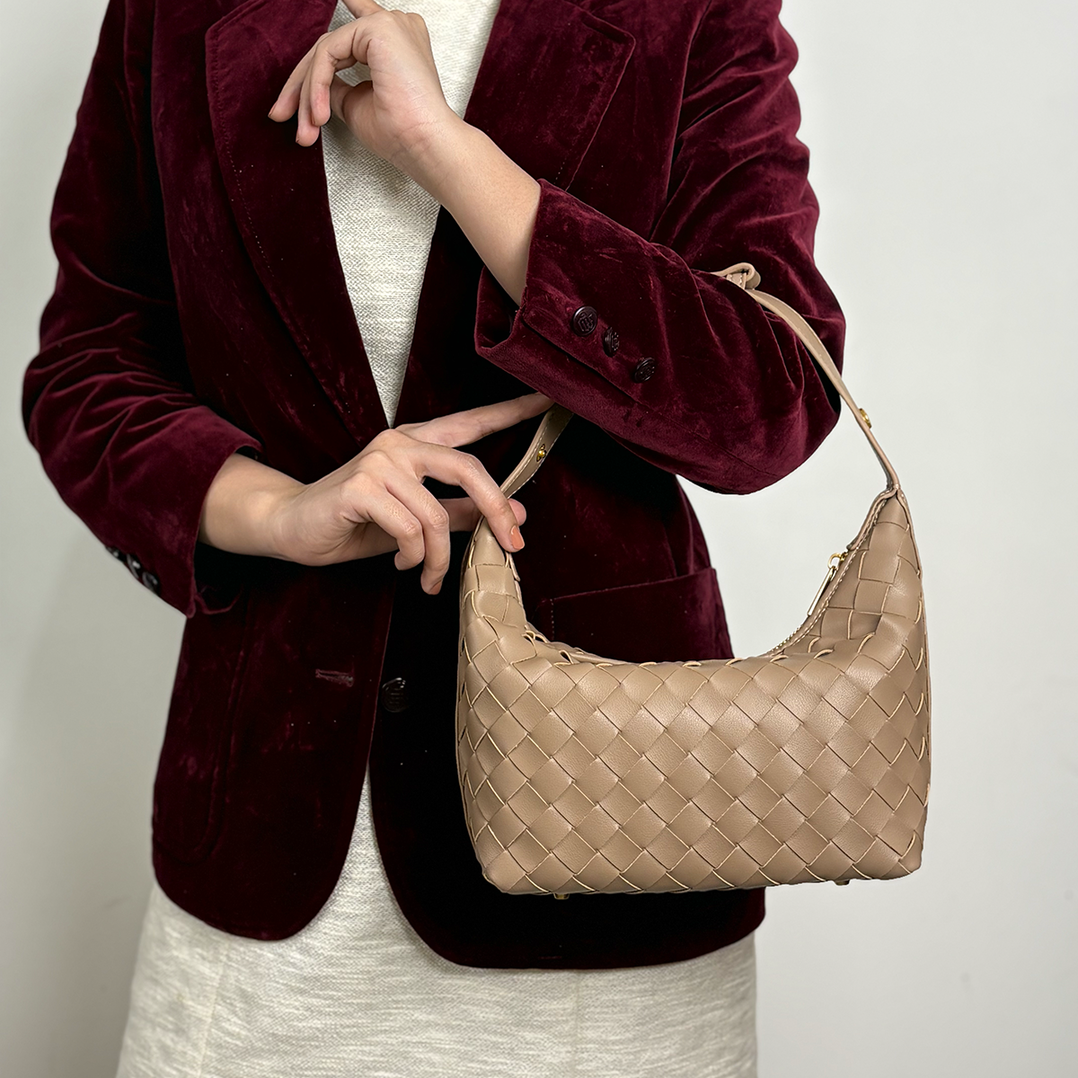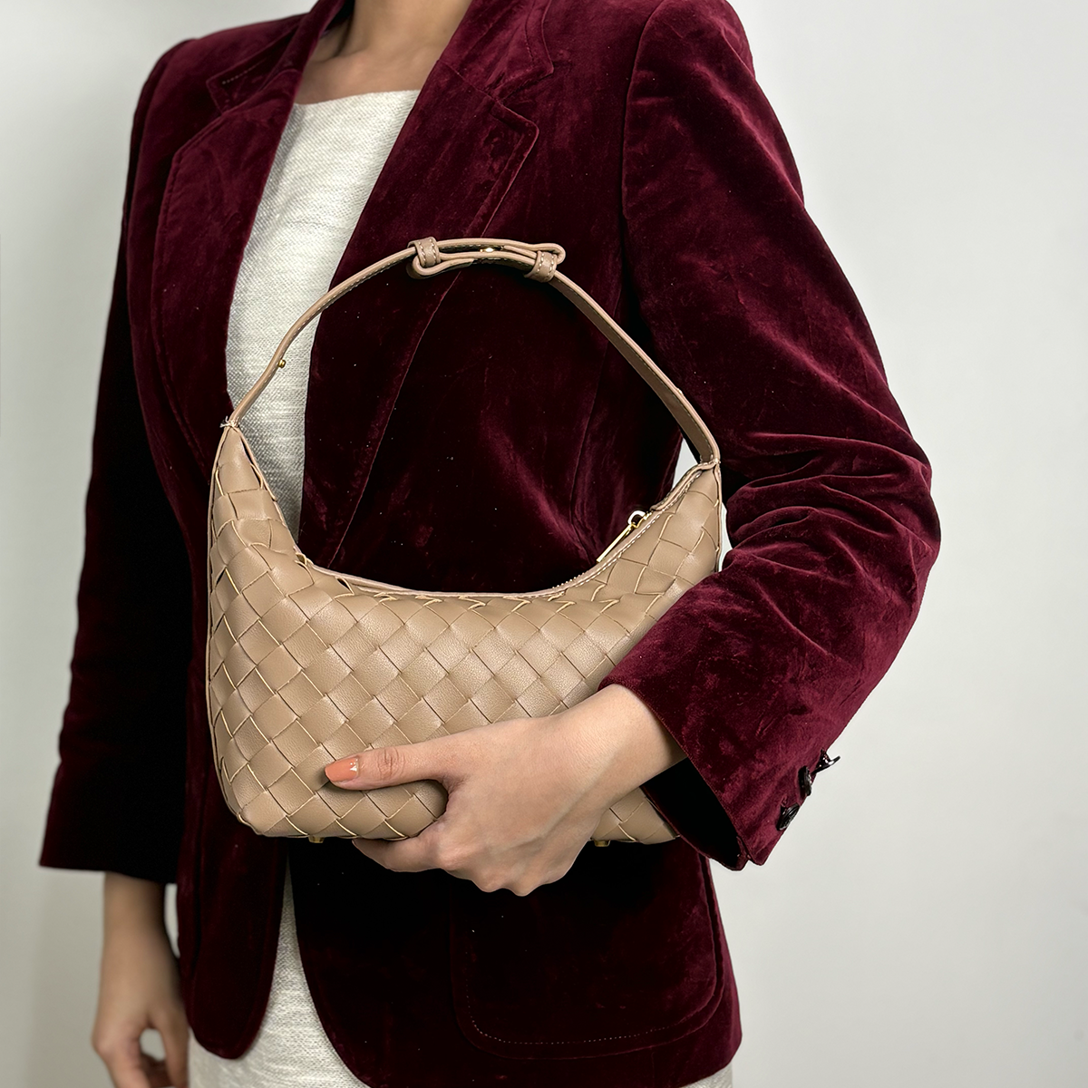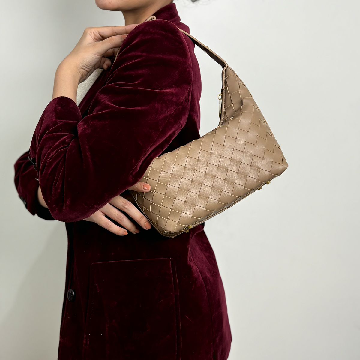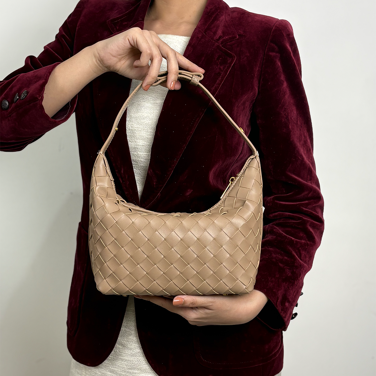 THB-03ND NUDE COLOR OF RIELA HIGH QUALITY LEATHER WOVEN SHOULDER BAG